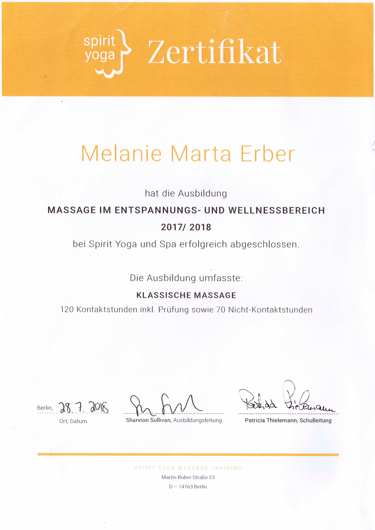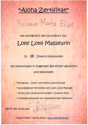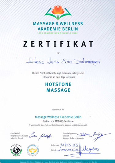 Meine erste Ausbildung absolvierte ich bei Spirit Yoga Berlin, wo ich die klassische schwedische Massage lernte. Danach reiste ich nach Asien, wo ich die Grundausbildung in Thaimassage und Fußreflexzonenmassage machte. Später kamen Lomi Lomi, Hot Stone und weitere Techniken dazu – all das fließt heute in meinen ganzheitlichen, intuitiven Ansatz ein.